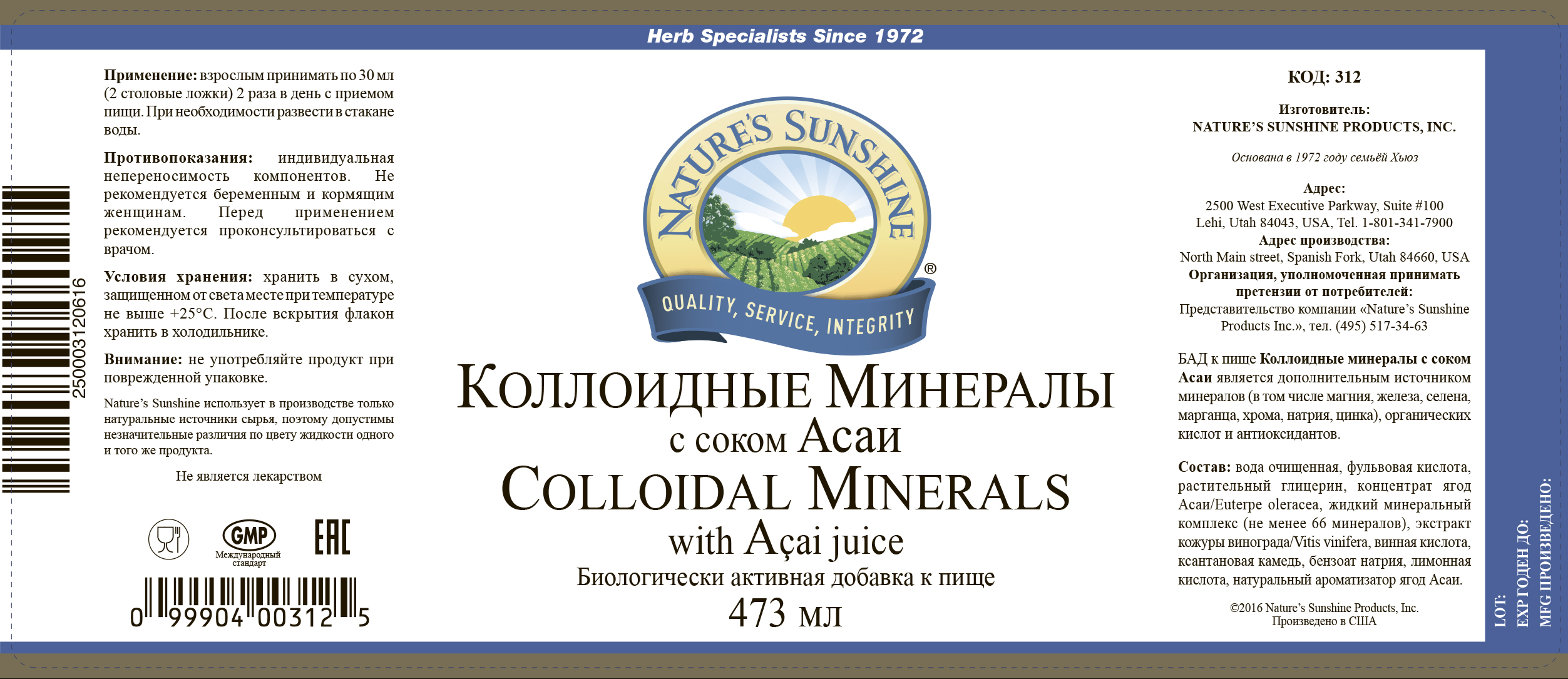 БАД к пище Коллоидные минералы с соком Асаи является дополнительным источником минералов (в том числе магния, железа, селена, марганца, хрома, натрия, цинка), органических кислот и антиоксидантов.