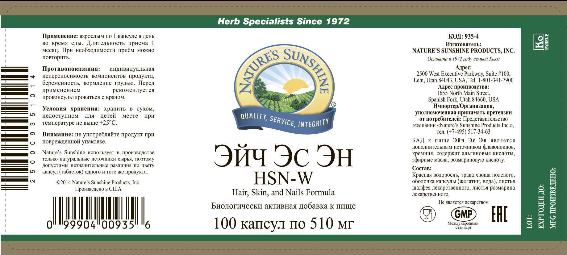Компания NSP разработала биологически активную добавку Эйч Эс Эн (HSN означает: hair – волосы, skin – кожа, nail – ногти) на основе природных компонентов, обеспечивающих организм веществами, которые ученые называют «факторами молодости»: витаминами, биоэлементами, флавоноидами. В нее входят порошки красных водорослей, полевого хвоща, шалфея, розмарина.